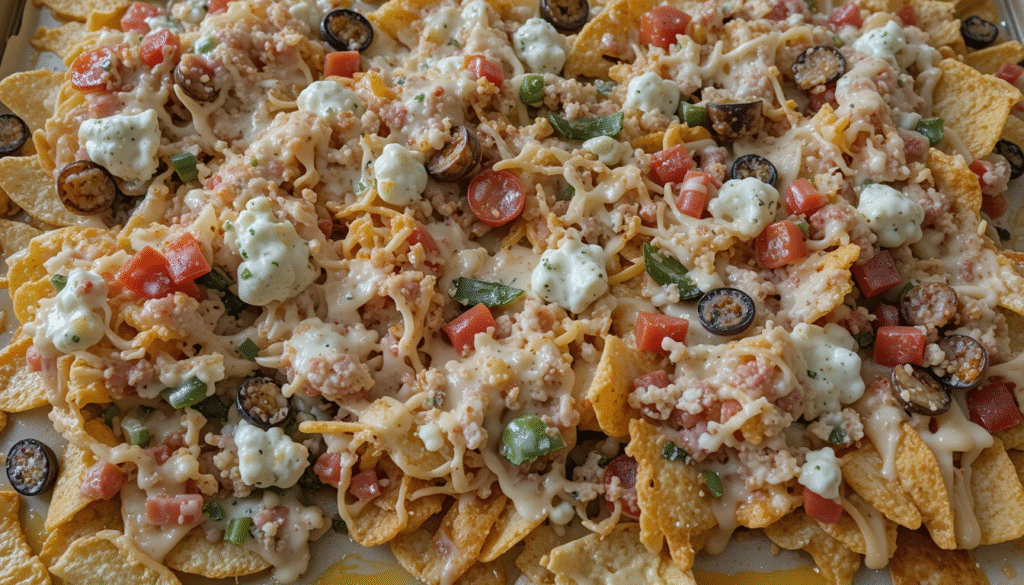 - Layer chips, meat, beans, and cheese on a pan.